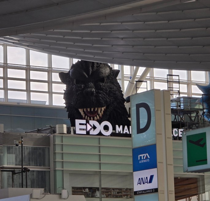 Non troverete foto di templi o piatti di ramen, l’unica foto di quella mattina all’aeroporto di Haneda è quella di Godzilla che mi ha salutato prima dell’imbarco.