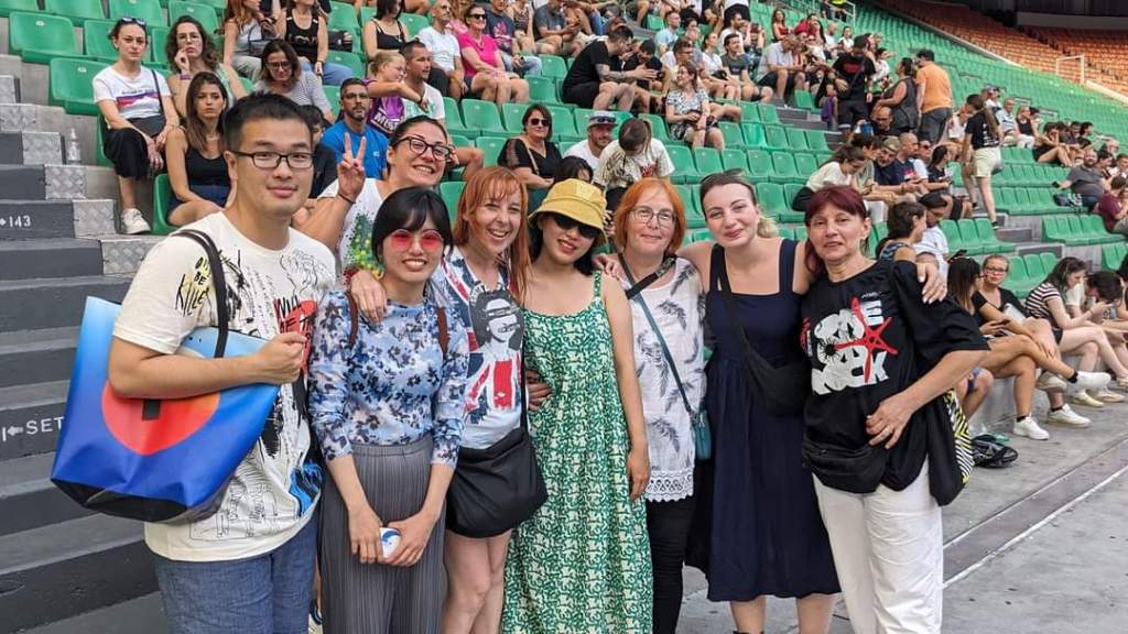 Ah se il mondo funzionasse così, che bello sarebbe, gioire insieme per qualcosa che fa battere il cuore, cercare quello che unisce e non quello che divide. È stato così che ci siamo ritrovati alla fine: due giapponesi, due rumene, una coreana e noi due italiane (la ragazza dietro è imboscata, è la fidanzata del ragazzo a cui abbiamo chiesto il favore “Ci fai una foto?”, quindi in effetti nella foto le italiane sono tre).